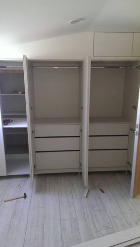 這是我房間的系統衣櫃,我選擇淺色系,中間很多抽屜,可以收納很多小物品